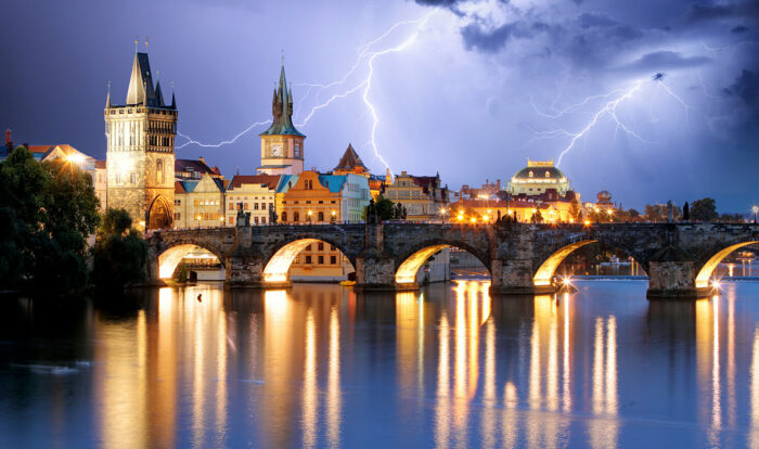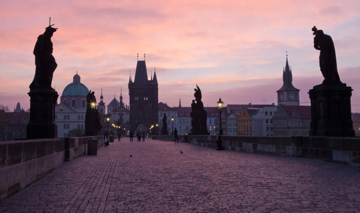 Es el más antiguo del país y está ubicado sobre el río Moldava, conectando la ciudad vieja y la ciudad nueva con una sujeción de 16 arcos.